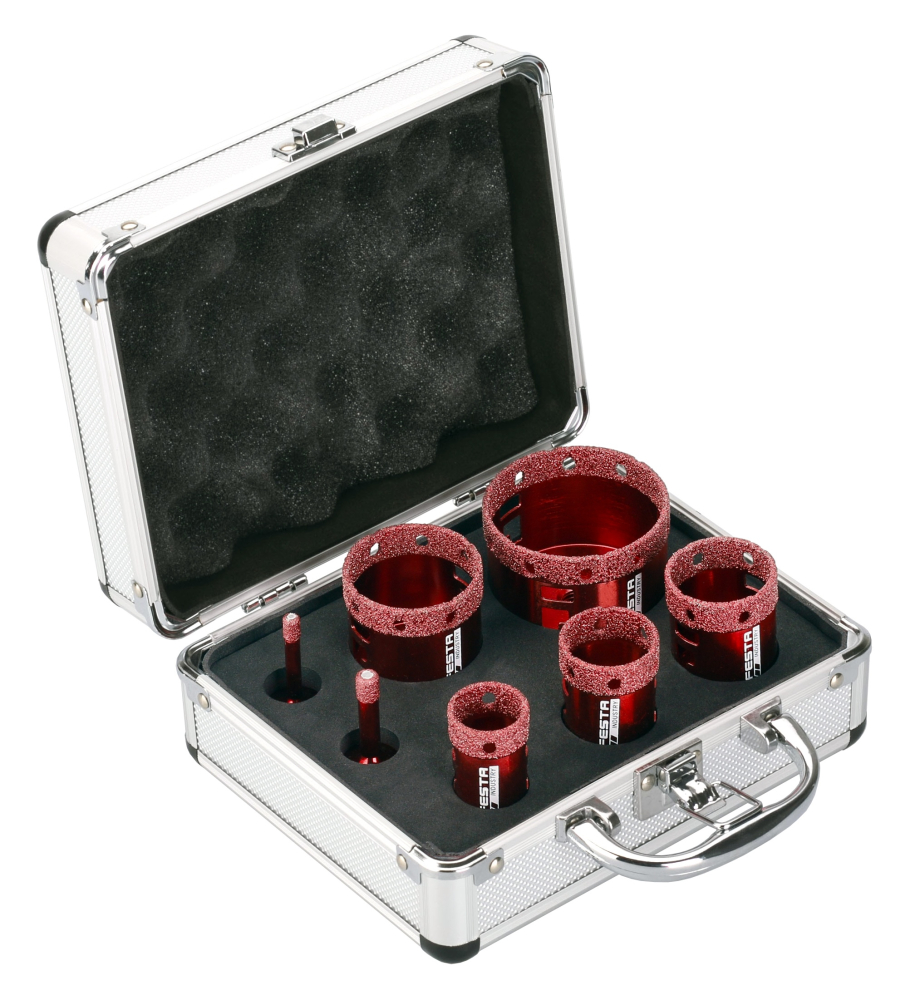 Súprava obsahuje profesionálne vykružovacie diamantové korunky s priemermi 6, 8, 10, 20, 35, 45, 55 a 68 mm. Tieto rozmery zodpovedajú najčastejšie používaným otvorom pre uchytenie sprchových kútov, vodovodné priechodky, odpadové rúry alebo elektroinštalačné krabice.