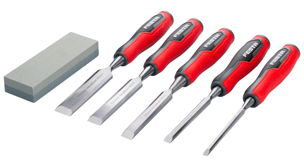 • Sada dlát FESTA 5 ks so brúskou a ergonomickou plastovou rukoväťou, úderová plocha.