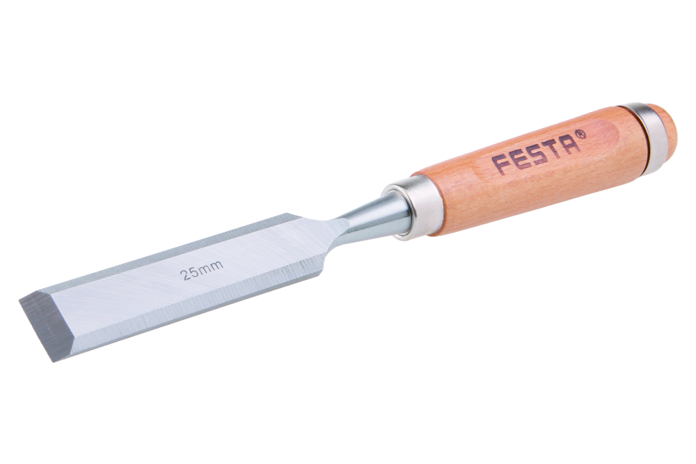 Dláto CrV 25mm/280 mm s ergonomickou rukoväťou z bukového dreva, úderová plocha s kovovým krúžkom, ktorá zvyšuje jej pevnosť.