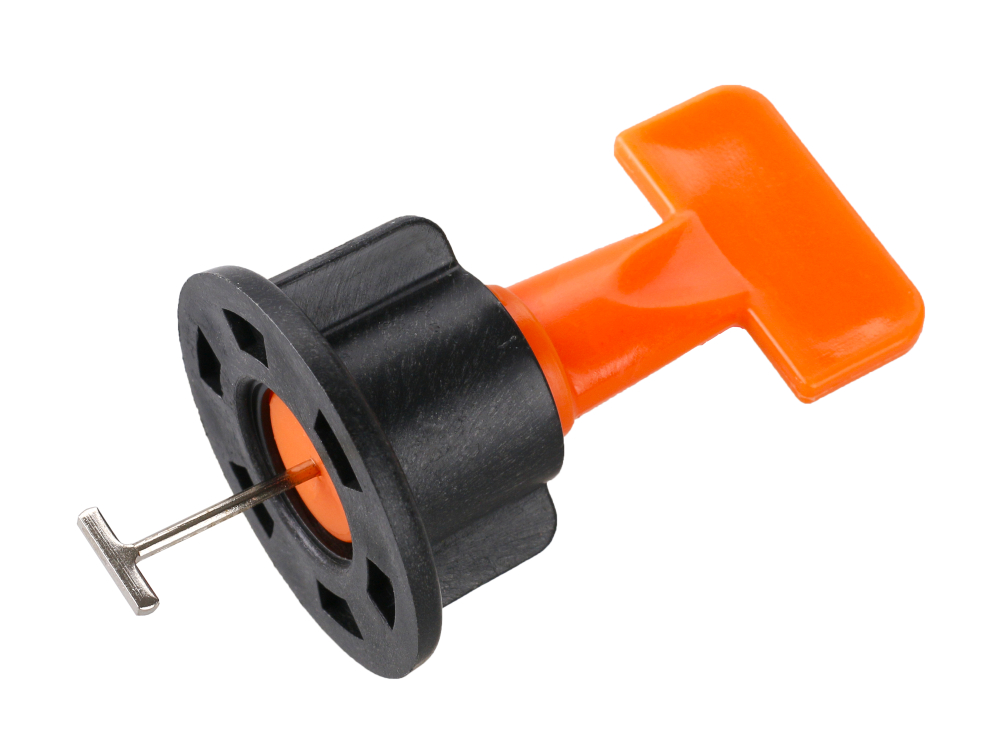 - jednoduchý postup - vložiť "T" koncovku do škáry (min. 1,5mm) medzi dlaždicami, následne pootočiť o 90 stupňov a dotiahnuť primeranou silou maticou, ktorá vďaka ploche vyrovná dlaždice proti sebe, na uvoľnenie použite priložený kľúč