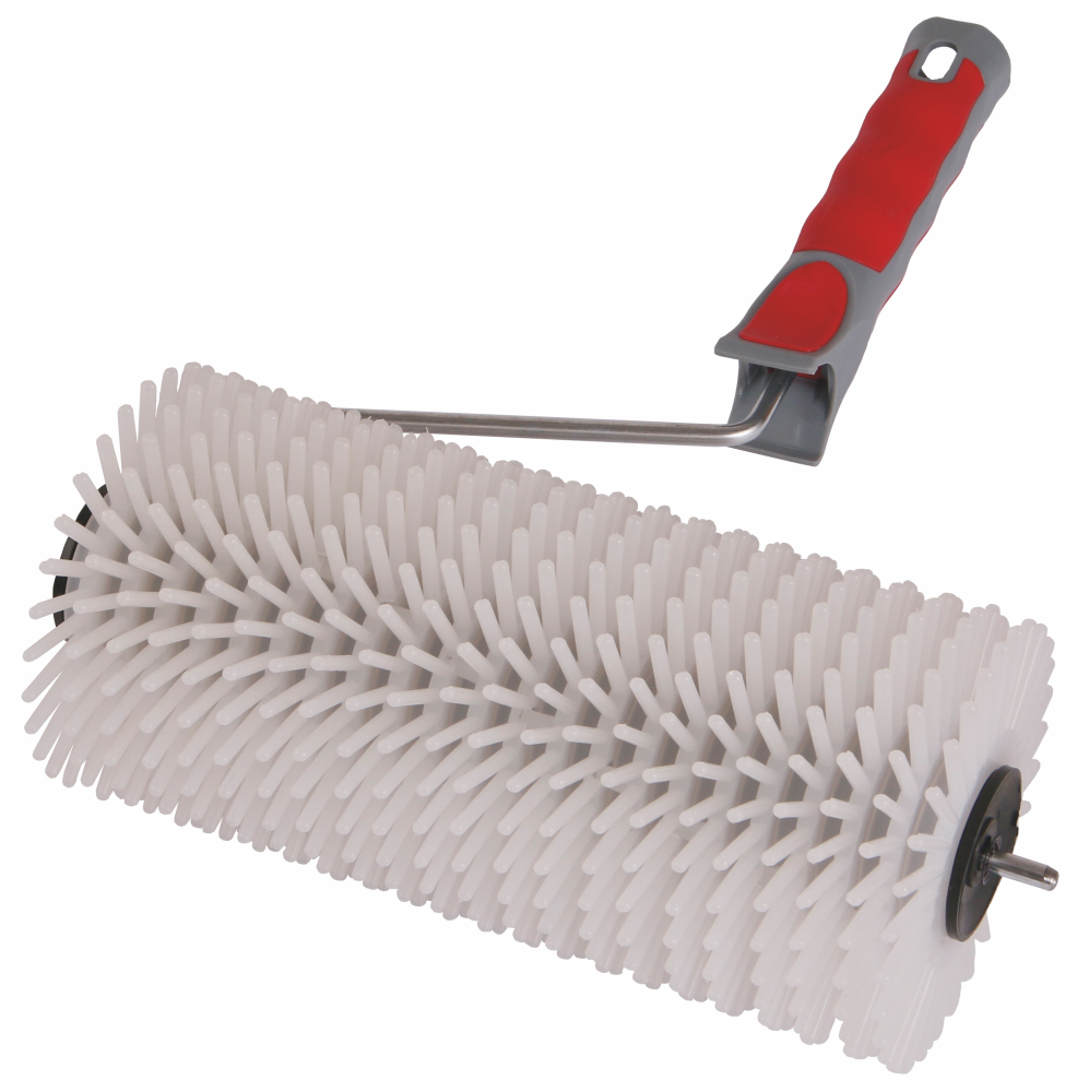 Nivelačný valček určený na odvzdušňovanie a rovnomerné rozprestieranie samonivelačných stierok a poterov po ich nanesení. Ideálny na prácu so strednovrstvovými, hrubovrstvovými a epoxidovými stierkami a potermi. Vďaka plastovým hrotom s výškou 34 mm vytvára jemné vibrácie, ktoré efektívne odstraňujú vzduchové bubliny a napomáhajú dokonalému rozliatiu po ploche a kontaktu hmoty s podkladom. Pevné plastové telo s ergonomickou pogumovanou rukoväťou zaručuje pohodlnú manipuláciu. Rukoväť je vybavená otvorom na teleskopickú tyč, čo umožňuje prácu v stoji a predĺžený dosah aj na veľkých plochách. Odstránenie vzduchu z poteru je kľúčové pre dosiahnutie hladkej, trvácnej a estetickej povrchovej úpravy.