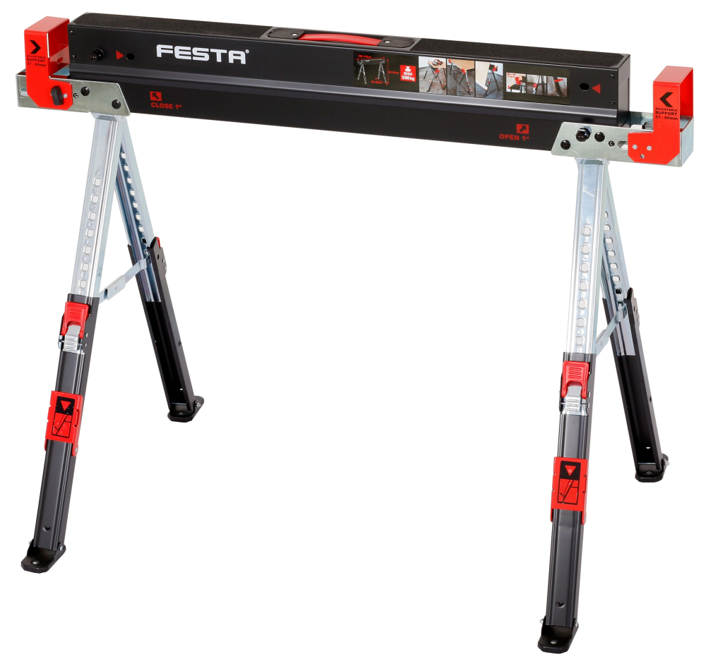 - nosná plocha s protišmykovou vrstvou, na jednej strane nôh vyklápacie opierky pre OSB dosky, lamino, atď. s nosnosťou 30kg na jednu opierku