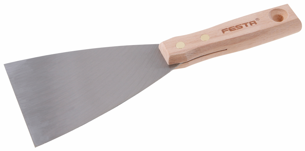 maliarska stierka (špachtľa) s brúseným oceľovým rezom a s drevenou nitovanou rukoväťou