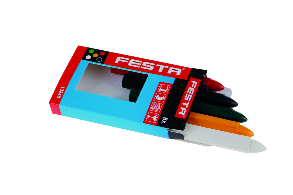 • Sada pastelových fixiek, dĺžka 120 mm, v balení 5 farieb (červená, čierna, žltá, zelená, biela).