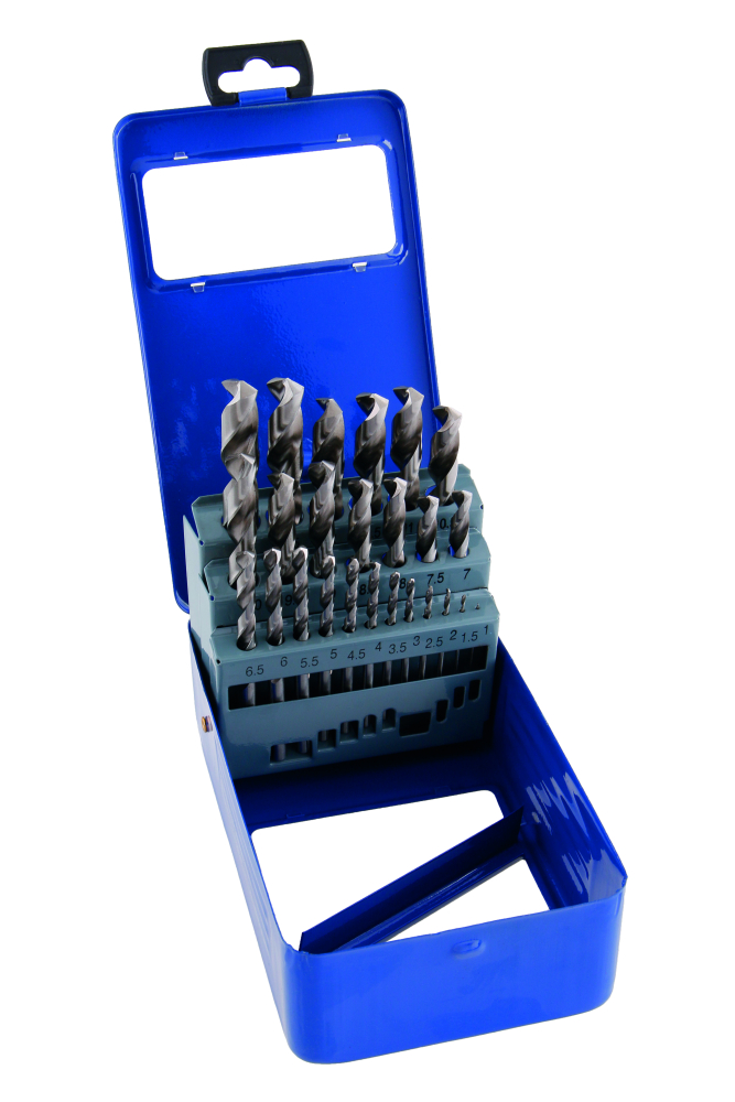 - Sada vybrúsených vrtákov HSS-G, spĺňajúca normu DIN 338, RN, vrtáky sú vyrobené z vysoko kvalitnej rýchloreznej ocele (HSS), oceľ je zušľachtená zliatinami - Wolfrám 9%, Molybdén 3%, Chróm 4%, Vanádium 1% - pre vŕtanie ocelí do 900 N/mm.